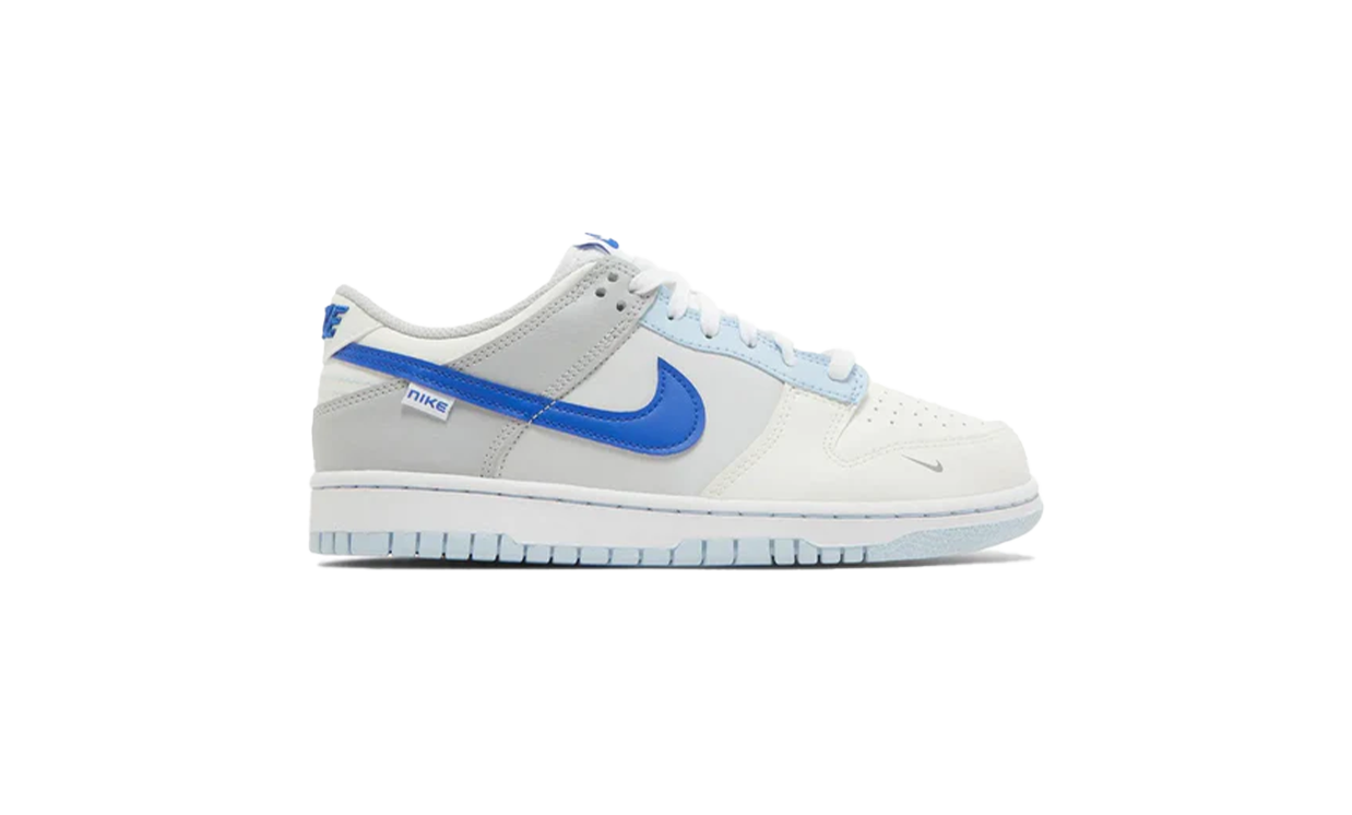 Nike Dunk Low avec un design moderne et épuré. La sneaker arbore une base en blanc cassé avec des empiècements gris clair et des détails en bleu vif, notamment le Swoosh latéral et les lacets bleu ciel.